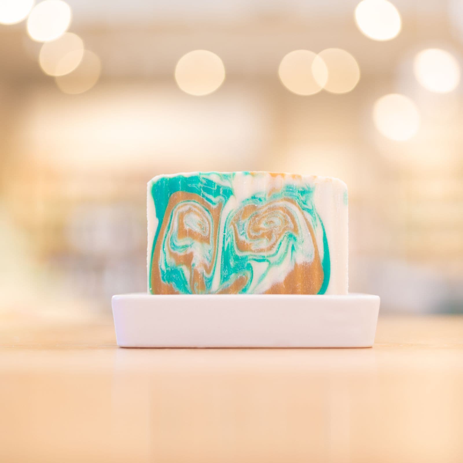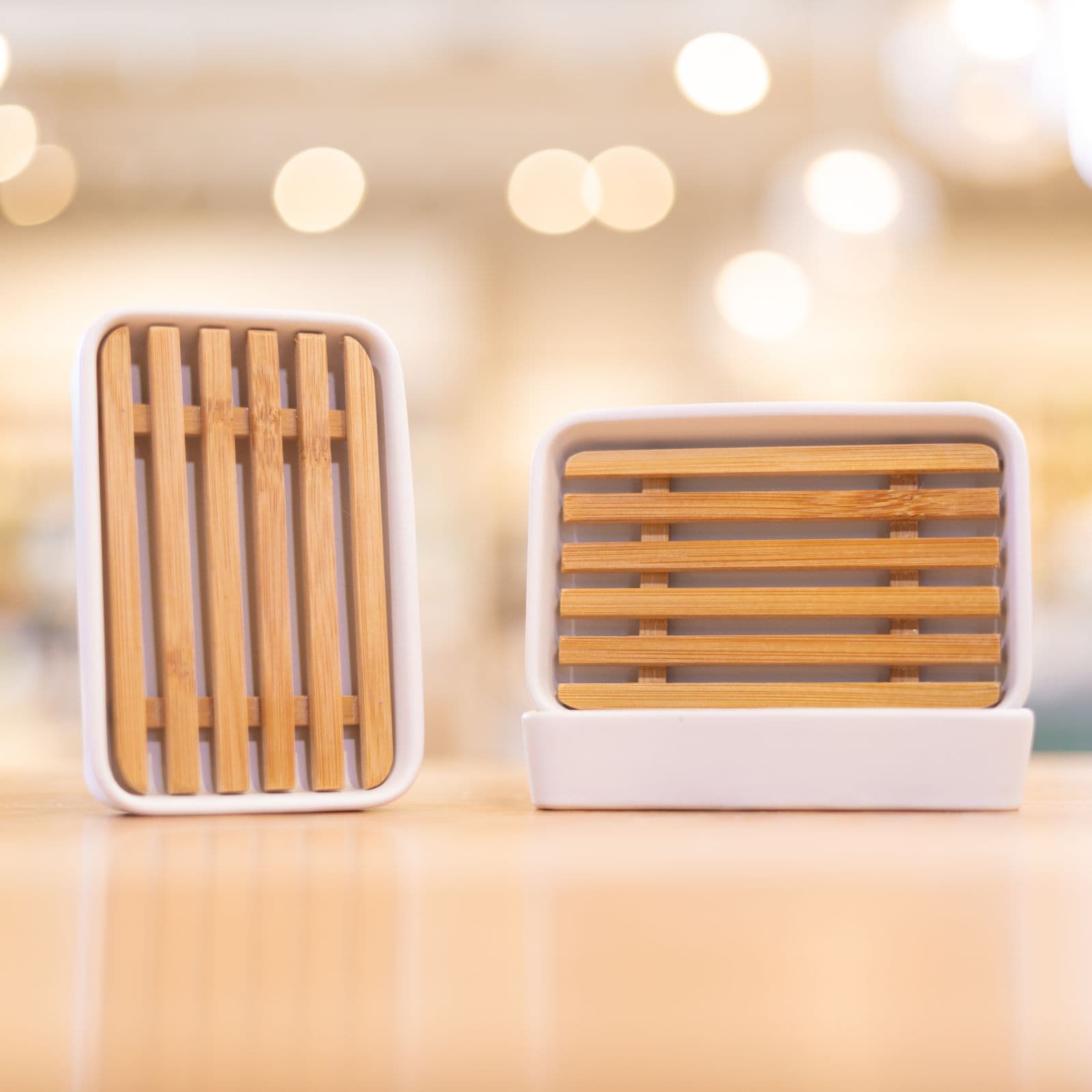 Our Porcelain + Bamboo Soap Dish is available in a neutral white color to stylishly keep your Soap Bar dry between uses!