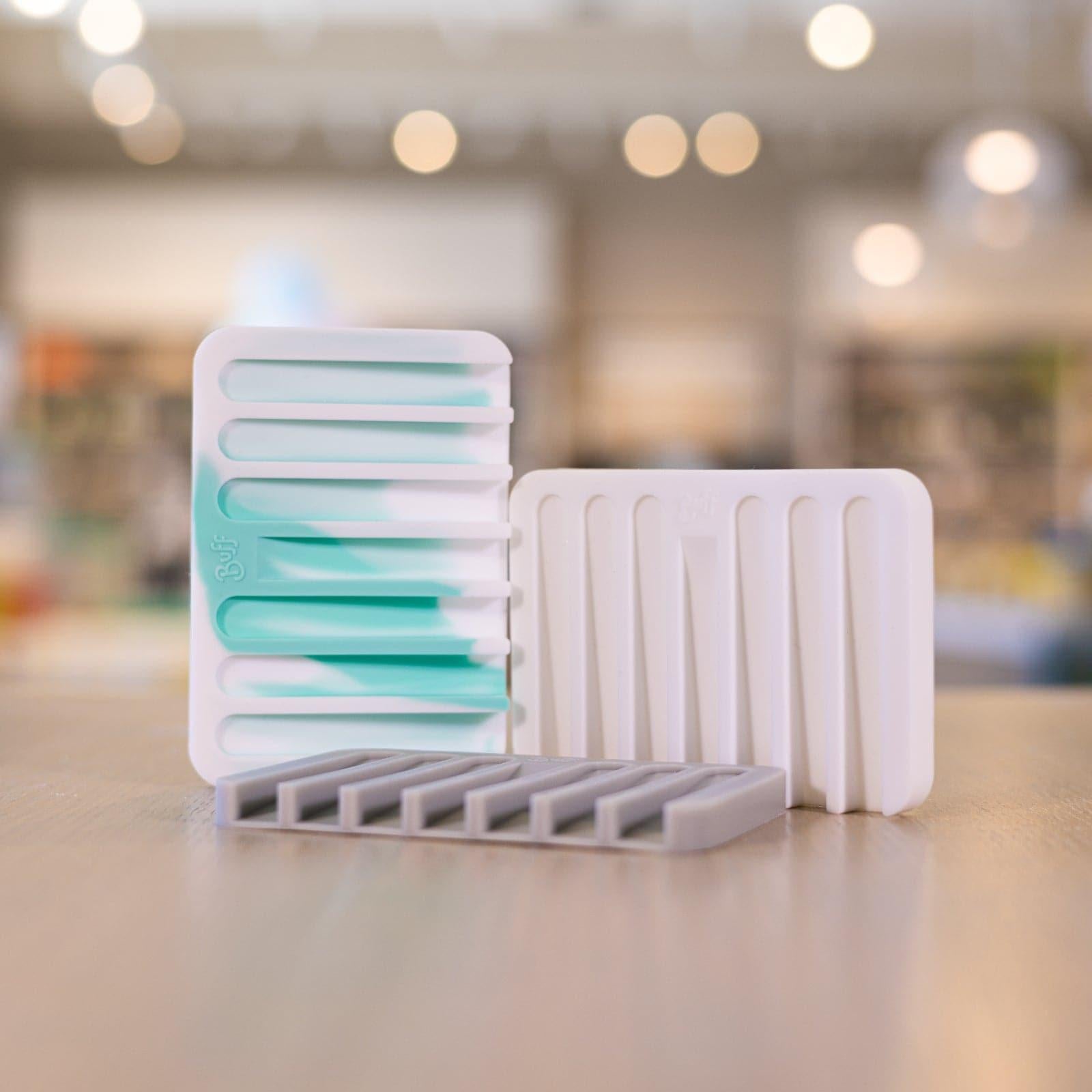Simple and easy to clean, the Buff Swirl Silicone Soap Dish has a groove and slat design that funnels water away from your Soap Bar, drying in between uses to help prolong the life of your soap.